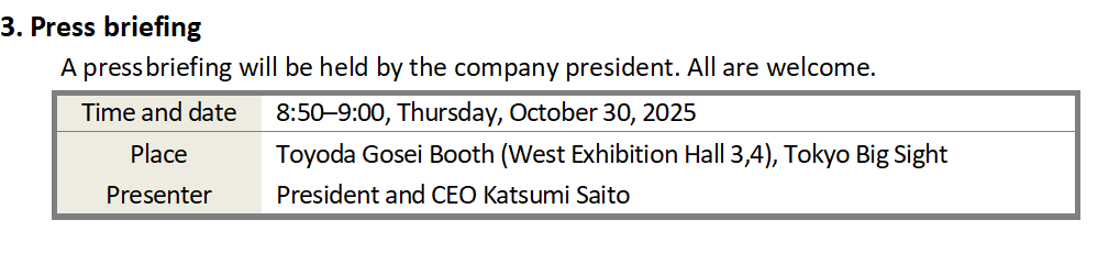 Kiyosu, Japan, October 9, 2025: Toyoda Gosei Co., Ltd. will exhibit at the Japan Mobility Show 2025, to be held from