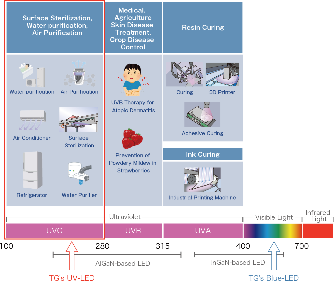 Leveraging the technology we have cultivated with InGaN-based blue LEDs, we propose AlGaN-based UV-C LEDs and their application products.