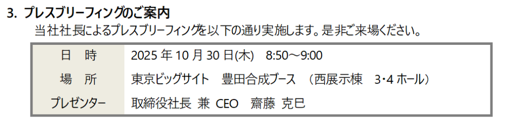 豊田合成株式会社(本社:愛知県清須市、社長 兼 CEO:齋藤克巳)は、10月30日から11月9日まで